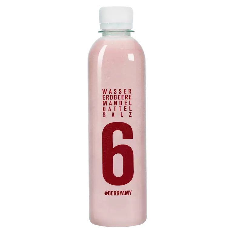 Amy Almond ist ein Mandeldrink und unser geheimes Highlight. Ihr cremig-nussiger Geschmack aus Mandel, Erdbeere, Dattel und Salz ist der perfekte Abschluss für deinen Safttag.